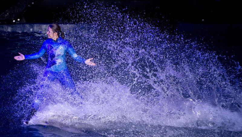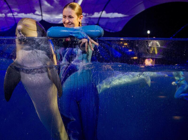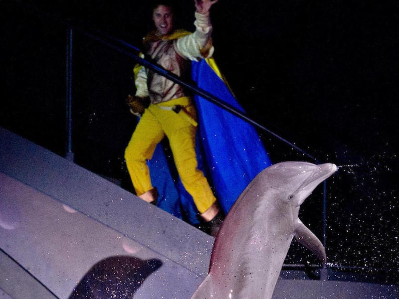 The 25-minute show includes professional actors in elaborate costumes, colorful animation on a giant screen at the back of the performance tank and original music by composer Tim Williams recorded by a 61-piece orchestra at Sony Pictures Studios in Los Angeles. Each show is unique, though, because dolphin trainers vary which tricks the playful gray mammals perform to keep them engaged in the show and to keep visitors guessing what's next.
