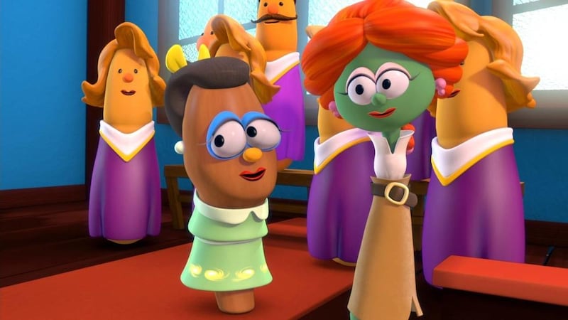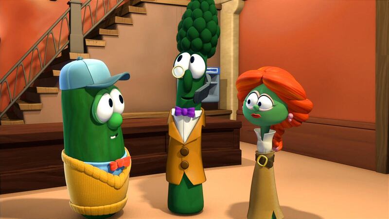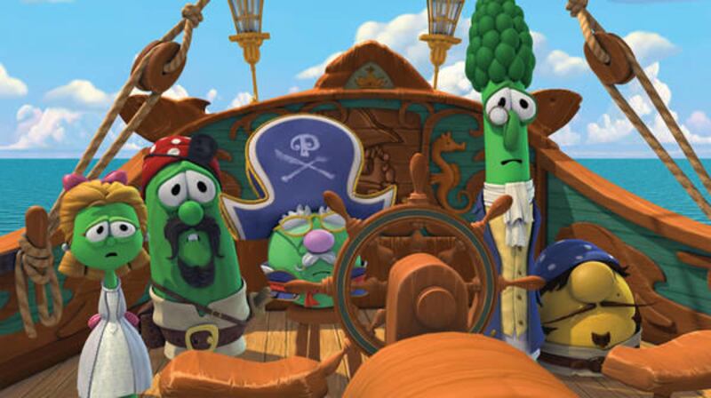 That leads to some creative versions of biblical characters, beyond the fact they are represented by vegetables. For instance, King Nebuchadnezzar’s role is filled by a zucchini who owns a chocolate factory and wants his employees to sing praises to a chocolate bunny. The feuding parties in the Good Samaritan story are at odds because one side wears shoes on their heads, the other cooking pots. And the sailors who take the prophet Jonah out to sea are called the “Pirates Who Don’t Do Anything,” who “just stay home and lay around.”