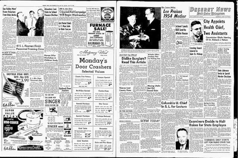 Meanwhile in Salt Lake City, President McKay's wife, Emma Ray Riggs McKay, was honored as the "Utah Mother for 1954" in special services at the Garden Park Ward chapel, 1150 E. Yale Ave. Gov. J. Bracken Lee called her the "perfect symbol of fine Utah motherhood."