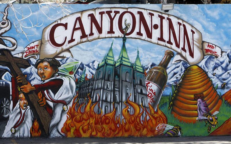 In a brief interview Friday, inn owner Jim Stojack said the mural represents "all things Utah, the good and the bad." He said the burning temple comes from the label of a beer bottle.