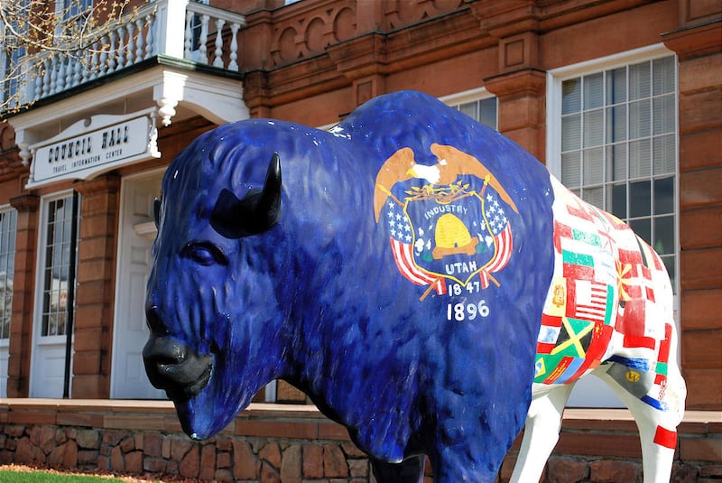 A beehive bison. What better way is there to underline the folkloric longevity of the Deseret beehive than a fiberglass bison statue decorated with elements of Utah's state flag (and other flags, as well), complete with a beehive and the motto "Industry," standing outside the Utah Travel Council offices on Capitol Hill?