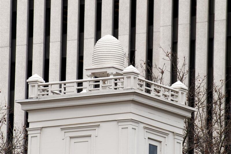 Beehives. Besides sitting atop Brigham Young's Beehive House, Deseret's symbolic beehive is everywhere to be found in modern Utah. Here it is evocatively featured in a frosted window of the Joseph Smith Memorial Building's Nauvoo Cafe. An even more impressive hive tops this beautiful building, the former Hotel Utah. Beehives continue to be a favorite image in Utah folk art, and other examples can be found, from the state flag to one side of the old Chase Mill in Liberty Park.