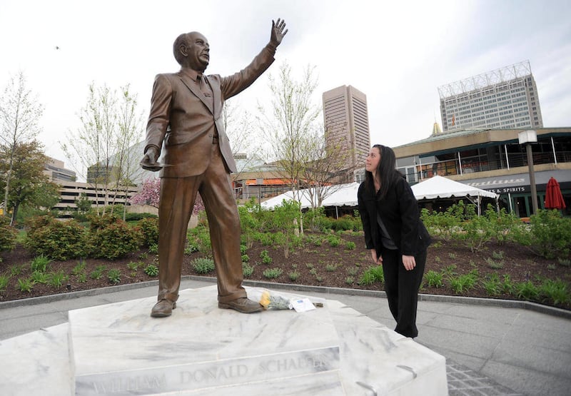 More than 30 years after Schaefer unveiled a completely renovated Inner Harbor — with an open plaza, shops and a 28-story World Trade Center — residents came to a statue of Schaefer there to pay their respects Tuesday. Schaefer had attended the dedication just 17 months ago.