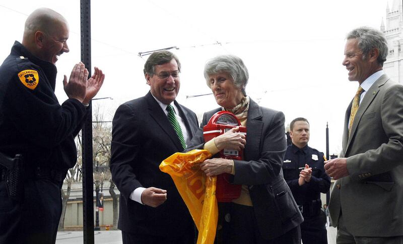 SALT LAKE CITY — Pamela Atkinson smiled as she wrapped her arms around the bright red "donation meter" on the southeast corner of Main Street and South Temple.