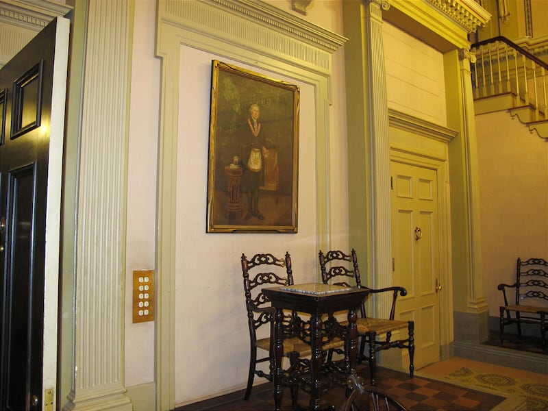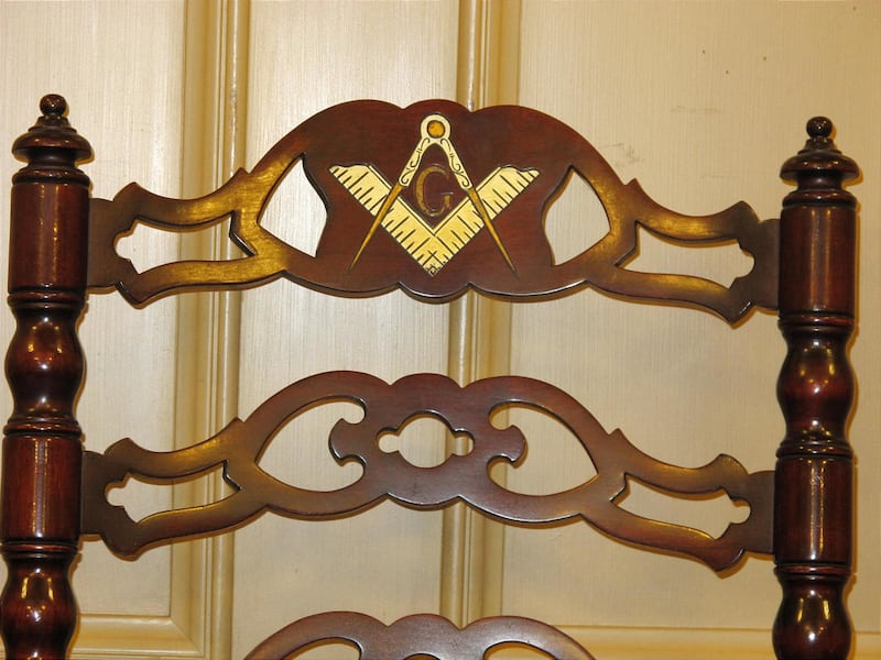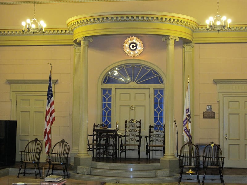 The lodge rooms — there's the Colonial room with a full-length portrait of George Washington in his Masonic apron, the Egyptian room, the Gothic room with an Olde English look and the Moorish room with an Islamic feel — all serve the same function and are interchangeable. Only decor and size differ. All are full of symbols of rock masons — the trade from which Free Masonry emerged at an undetermined time in the long ago past. There's the square, the level and the plumb. Each room is adorned by the letter "G," which stands interchangeably for Geometry, God or Great Creator of the Universe.