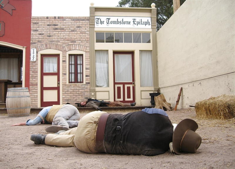 Every day — twice daily most weekends — players re-enact the shootout in a little open-air theater behind the livery and feed lot's office, not far from the actual site. Stephen Keith, who portrays Holliday as a drunken, swaggering dandy, says he structured the play as "a Greek tragedy with cowboy hats and six-guns."