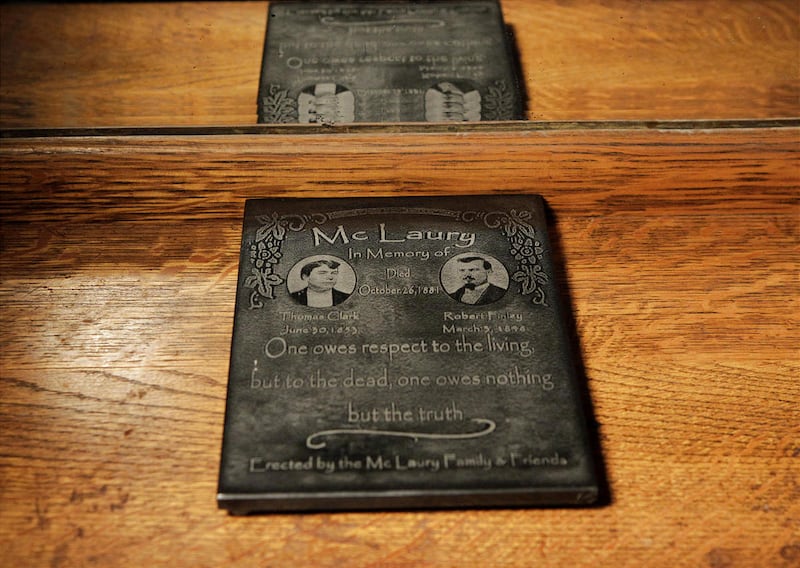 Hanging on the stucco wall surrounding the little amphitheater where the fusillade is re-enacted daily is a tiny bronze plaque. Unpretentious and easy to miss, it is dedicated, not to the badge-wearing Earps or their tubercular friend, John Henry "Doc" Holliday, but to the memory of brothers Frank and Tom McLaury — two of the three men who died that day.