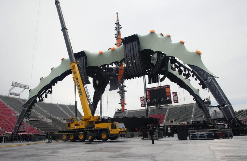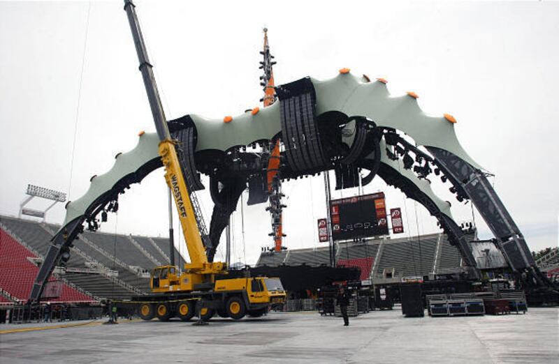 Setting up the stage for the 360 tour is like setting up a small city. The stage — nicknamed "The Claw" because of its four large posts that support the structure — takes about four days to build.