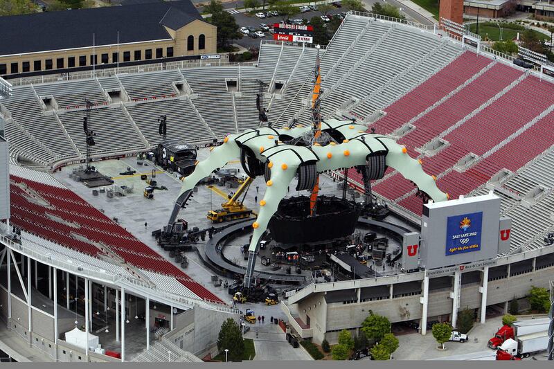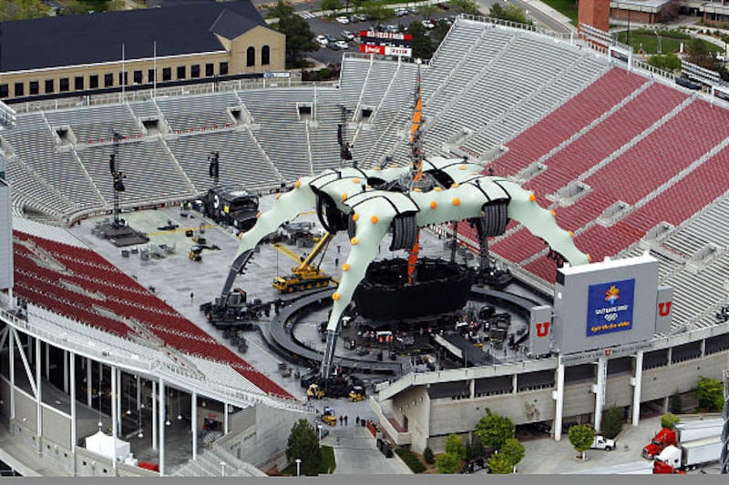 Tuesday, that make-shift stage design created by U2 frontman Bono over dinner will appear inside Rice-Eccles Stadium. But rather than a few culinary items, the full-scale production will be 204 feet wide, 144 feet deep with a tower that stretches 193 feet in the air. The entire stage weighs 400 tons and requires 48 semi-trucks to transport it between cities.