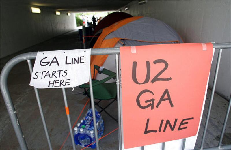 The line for general admission seating wasn't supposed to officially begin until 7 a.m. Tuesday. But fans started pitching tents near the stadium and creating their own lineup list at 10 a.m. Monday. Many of the first people in line had been to U2's last show in Denver and followed the band to Utah.