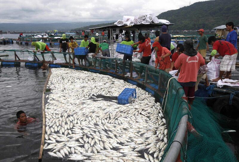 More than 400 tons of milkfish have died in Talisay alone since Friday in 84 out of about 1,000 fish pens — lake areas about half the size of a basketball court that are fenced off by bamboo poles and nets. Damage has been estimated at $770,000 (33 million pesos), Mendoza said. About 400 tons more have died in the other towns.