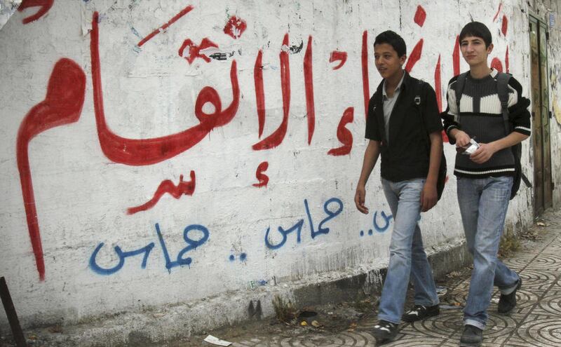 In Gaza City, motorists honked their horns and waved yellow Fatah flags, which had been banned for the past four years. Other people held placards of Fatah's iconic leader, the late Yasser Arafat, or hugged Hamas policemen.