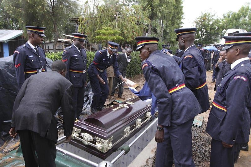 Wanjiru's funeral at a stadium in his hometown of Nyahururu, in Kenya's Rift Valley, was watched over by scores of police as his mother had threatened to disrupt the ceremony after accusing his wife of murdering him to get his property.