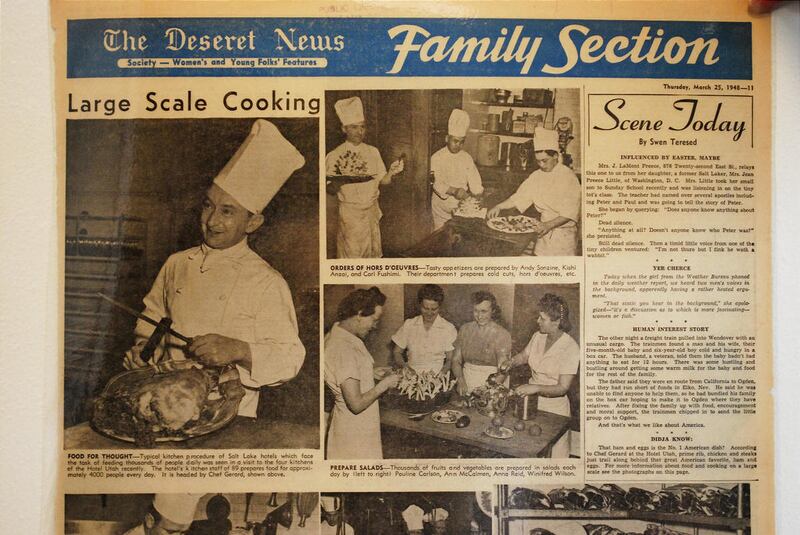 A Deseret News photo spread in 1948 noted that the kitchen's staff of 89 prepared food for approximately 4,000 people each day. And it also noted that the hotel used 1,500 to 3,000 pounds of meat daily. "Only choice grades are used, and it must be aged five weeks at 38 degrees."