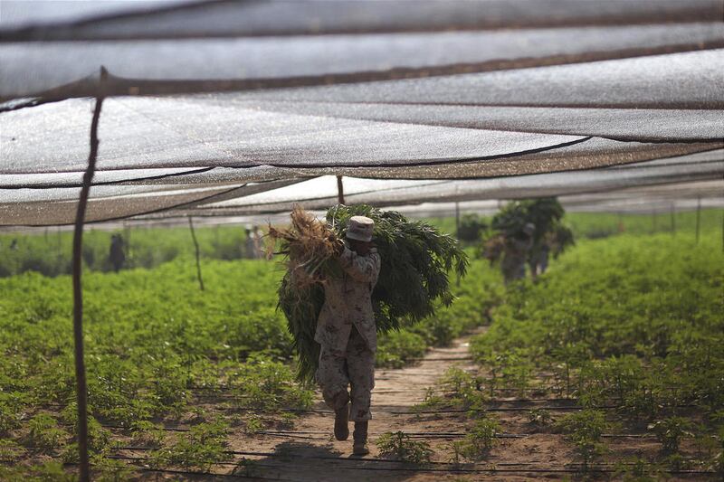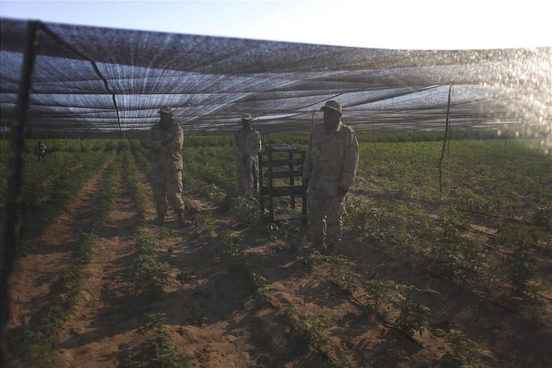 The army said that troops patrol this area of arid bushland and cactus every three to four months and that the plantation was not here just a few months ago. The operators used wells for water, and tiny irrigation hoses fed every plant. There were also discarded boxes of the herbicide Gramoxone.