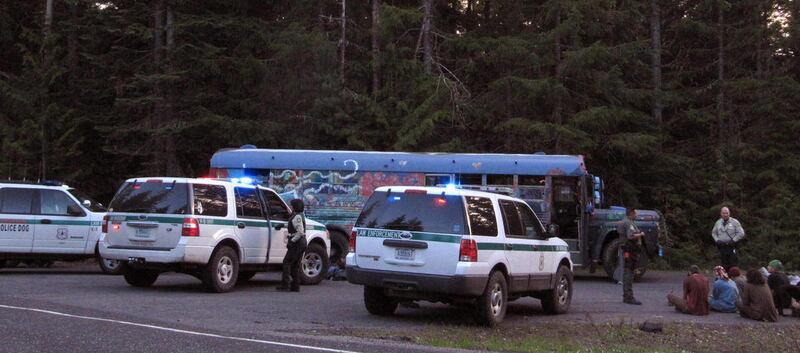 GIFFORD PINCHOT NATIONAL FOREST, Wash. — Lights flash in the dusk as police cars surround a blue school bus painted with colorful hearts and flowers. Several youthful hippies watch while officers search their bags and a police dog sniffs for drugs.