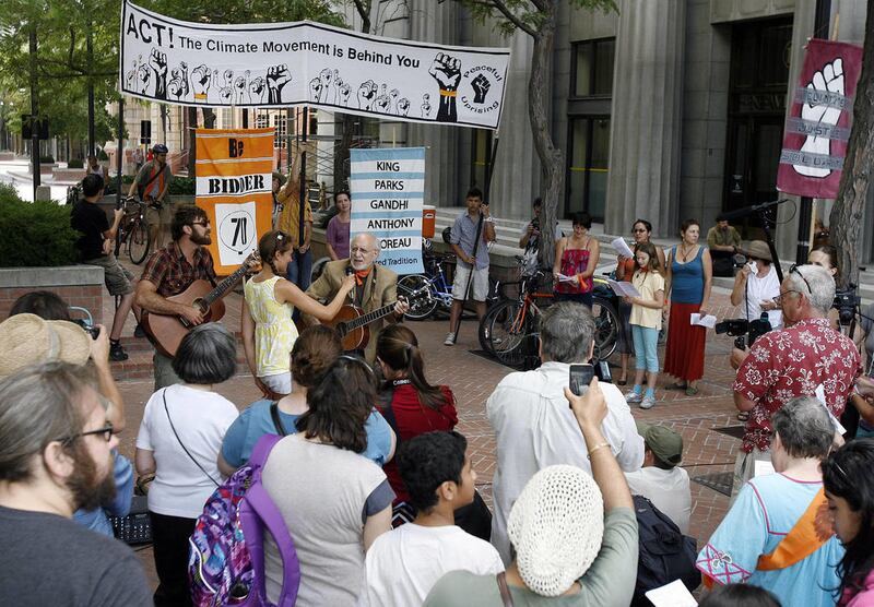 A red-faced Ashley Anderson, director of Peaceful Uprising — the group co-founded by DeChristopher — addressed the crowd, asserting "every federal courthouse in the country is the scene of a crime today."