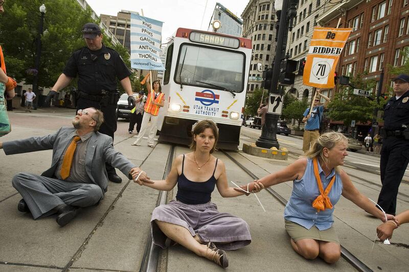 All were arrested without incident, Burbank said, and were booked for investigation of charges such as failure to disperse, unlawful assembly and blocking a roadway. Salt Lake police later reported seven protestors opted for citations, and 19 chose to be booked into jail.