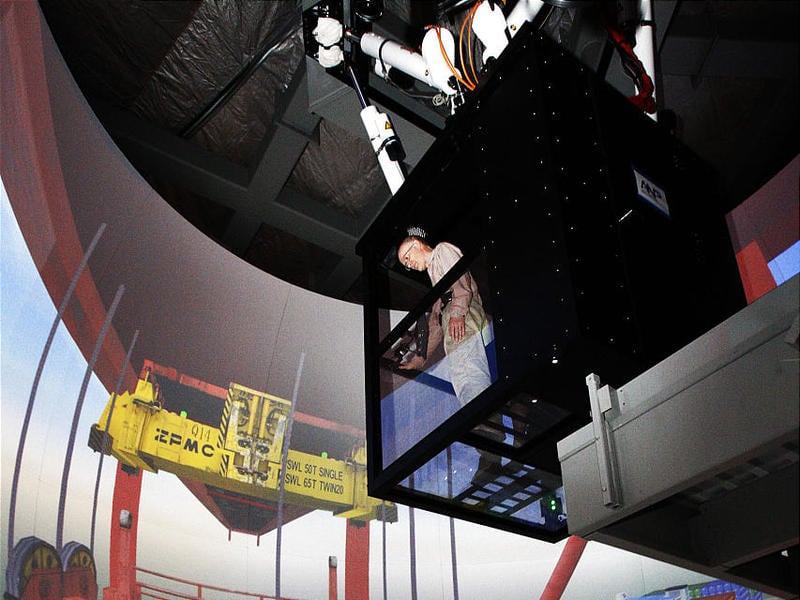 "This is the largest and most sophisticated crane and handling simulator in the world. The cab alone weighs 1,200 pounds," said Stauffer. "It'll take three to four weeks to disassemble, but it's designed to breakdown to panels that all bolt back together to create a seamless projected image that can be seen in real perspective."