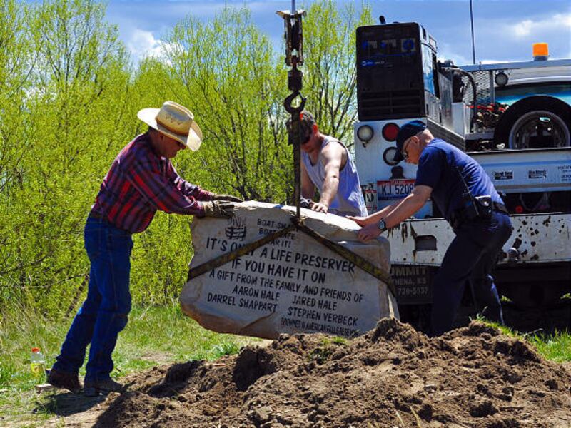 The first station, a couple of sturdy posts with a roof overhead, holds 10 life jackets and was erected on Memorial Day at the reservoir where the men died. Nearby, their names are etched into a memorial stone. The jackets are available to anyone who visits the lake without one or doesn't have enough for everyone in their party to be safe on the water, Duke said.