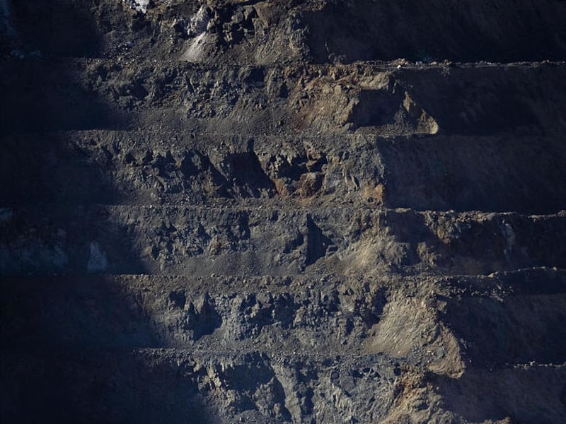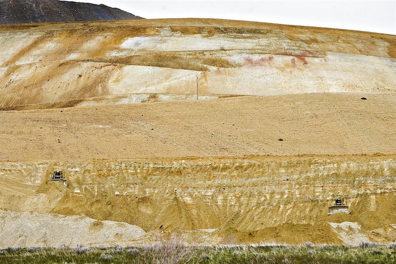 On a chilly May day, the wind is ruthlessly whipping its way up the hillside toward the great alien yellow piles of waste rock deposited from the mine. From a distance, the piles look like they're made of sand, 30 stories tall, but up close, each boulder is about as tall as a child. There are seagulls drifting overhead, and the calls of a songbird break the otherwise quiet of this forbidden territory that's locked behind a chain-link fence.