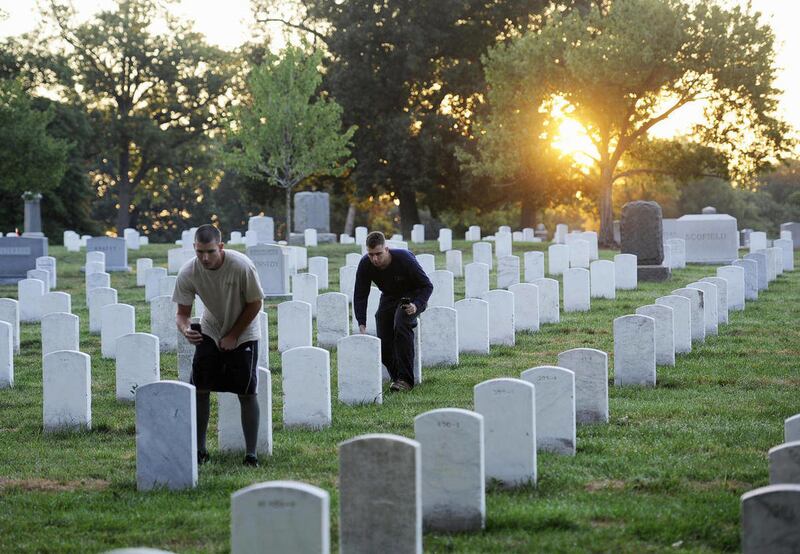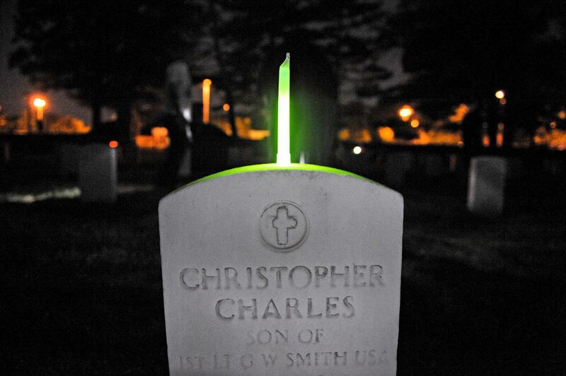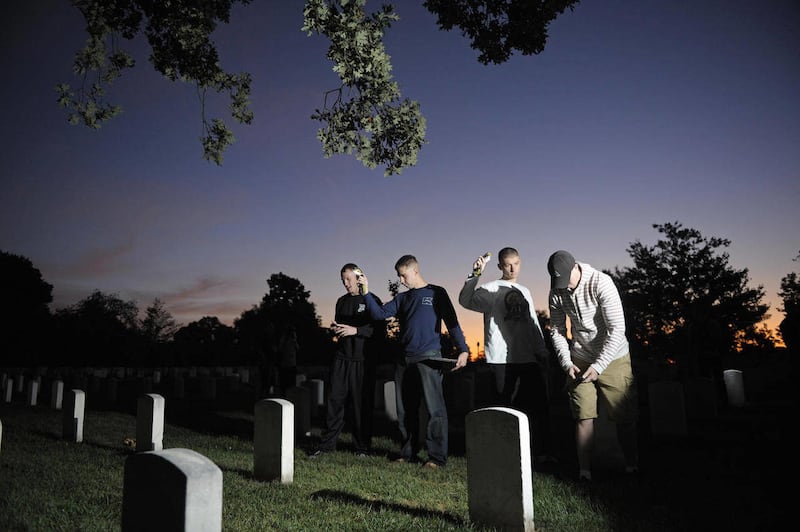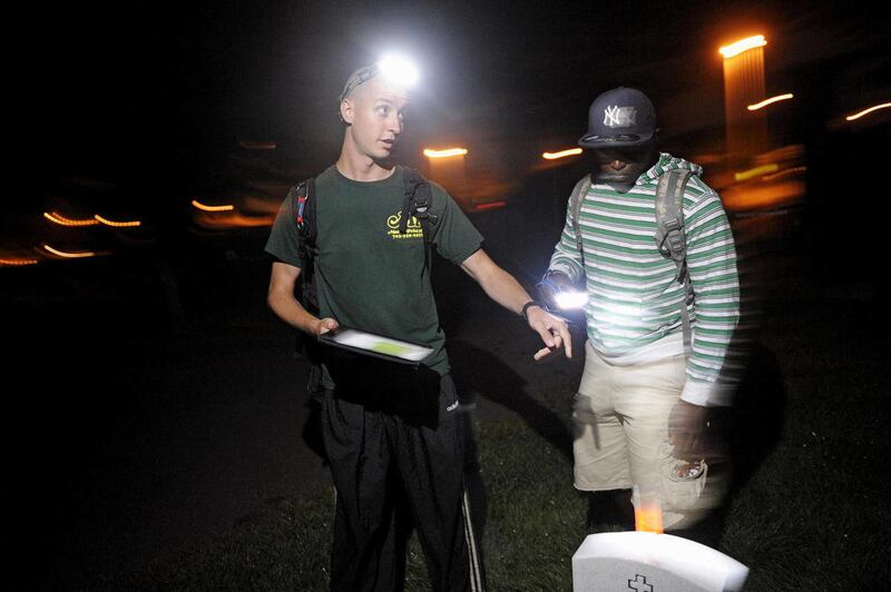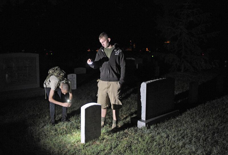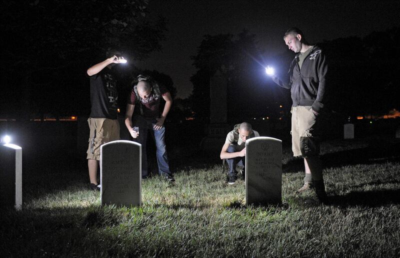 Old Guard troops usually wear dress blues and white gloves. But for this mission, they wear head lamps and T-shirts. They do their work at night to escape the summer heat and to avoid interrupting a funeral.