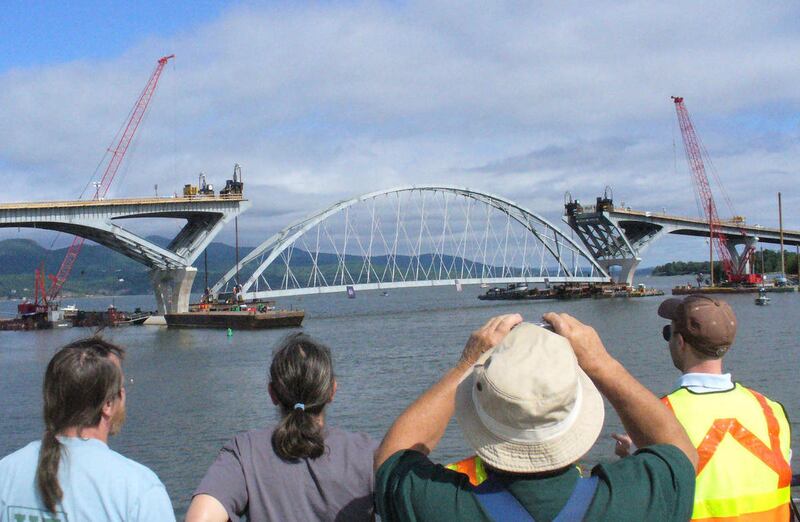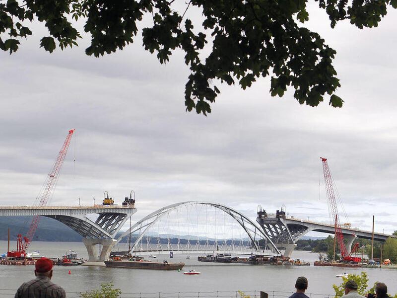 About 250 people gathered along the lakeshore at the Crown Point State Historic Site in sunny, 70-degree weather to watch the eight-story-tall arch make its way slowly across the lake to the southern narrows separating New York and Vermont. The original bridge linking Crown Point and Addison, Vt., was demolished in December 2009 after inspectors deemed the 80-year-old span unsafe. The new bridge will connect the same two communities.