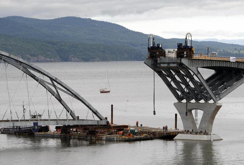 Crews then positioned the arch so it could be lifted into place using pairs of cable hoists mounted on each end of the uncompleted bridge. William Reynolds, spokesman for the New York state Department of Transportation, said the lifting started early Friday afternoon and was expected to take four to six hours to complete.