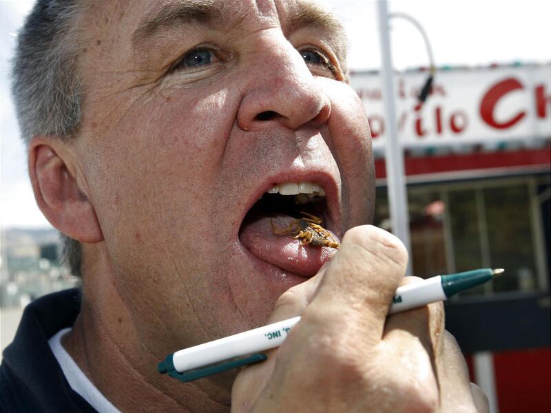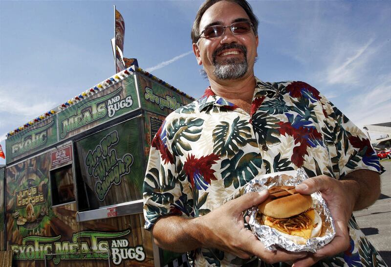 Jungle George's big seller is the maggot melt sandwich, made of cheese and maggots, also known as "baby worms." George said you'd be surprised how many people eat maggots on purpose. At the California State Fair he sold 23,000 maggots. I tried a maggot, followed by a scorpion. To be honest, they tasted a lot alike. Blindfold me and I couldn't tell you one from the other.