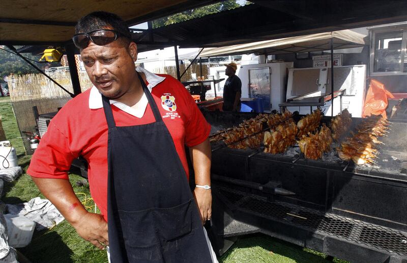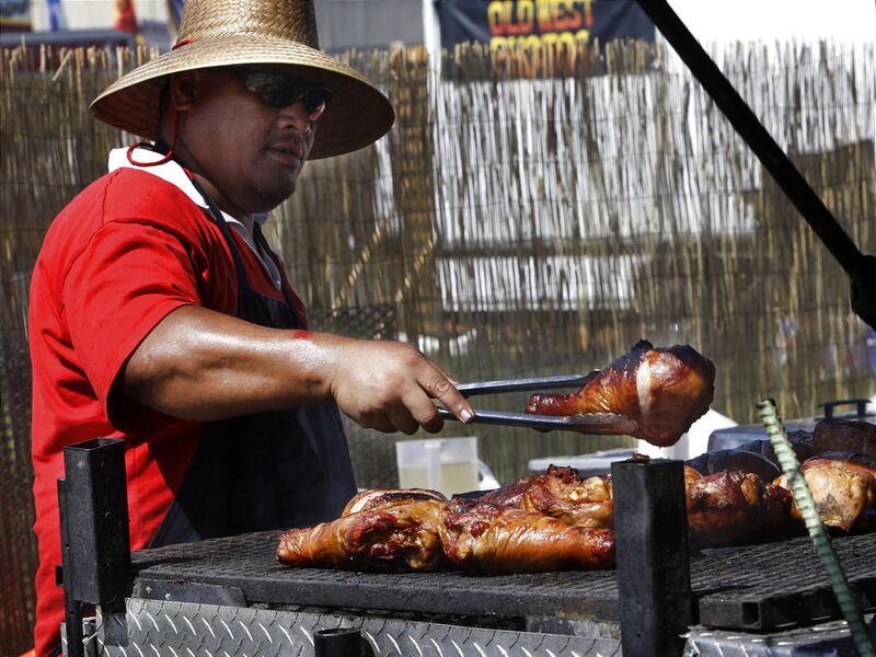 At the end of the loop I ran into the intoxicating aroma of the Hawaiian Vilo Chicken stand, run by a Tongan family, the Taufas, where they sell turkey legs, chicken and pulled pork.