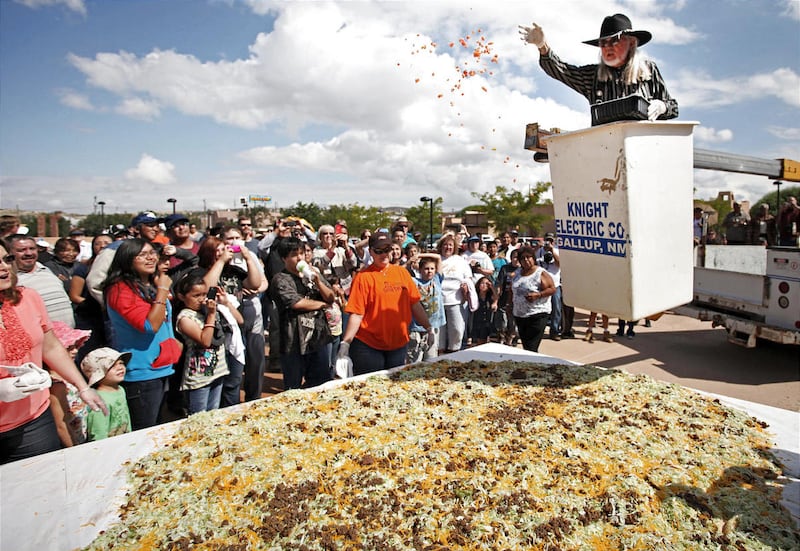 Among those who help build the massive taco were Gallup Mayor Jackie McKinney and employees from area businesses. McKinney finished the construction by using a cherry-picker truck to sprinkle diced tomatoes in the taco's center.