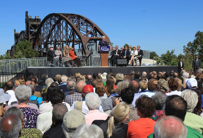 The 2,653-foot walkway is converted from an 1899 railroad bridge and crosses the Arkansas River. It opened briefly to the public after Friday's dedication ceremony, but officially opens on Sunday. Immediately after the dedication, a steady stream of cyclists crossed the bridge that connects Little Rock and North Little Rock.