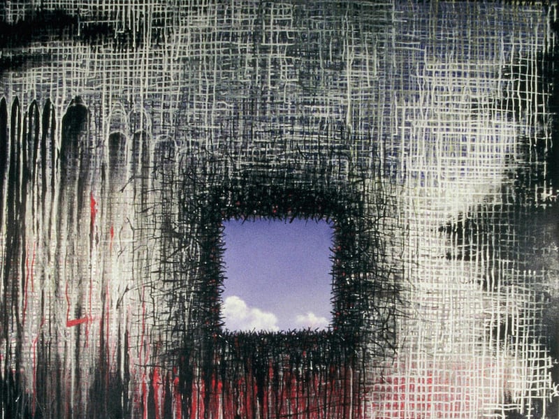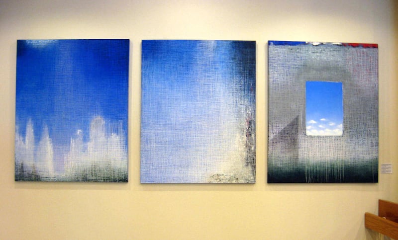 The focus of each panel is a central space that serves both as a metaphor for the towers' windows and their footprints. Shades of blue and lavender — signifying the clear blue sky that day — fill the "windows" and thick runnels of liquid paint suggest the grid patterns of the molten steel of the fallen towers.