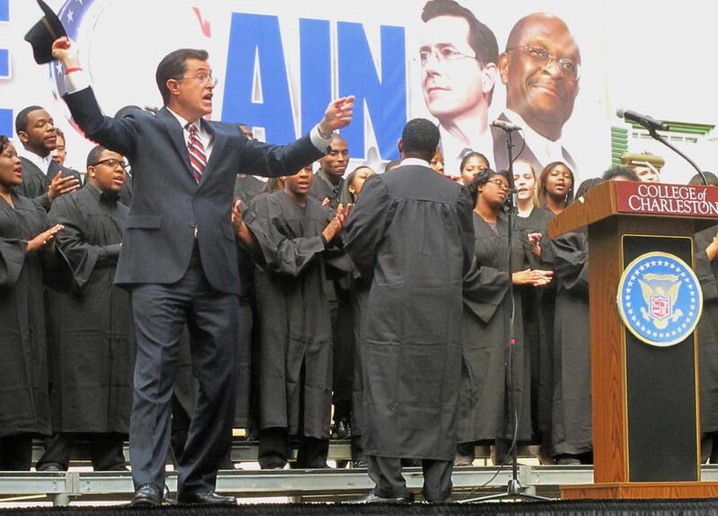 CHARLESTON, S.C. — Comedian Stephen Colbert, who says he's running for president of "The United States of South Carolina," is urging voters in Saturday's presidential primary to cast their ballots for former Republican hopeful Herman Cain.