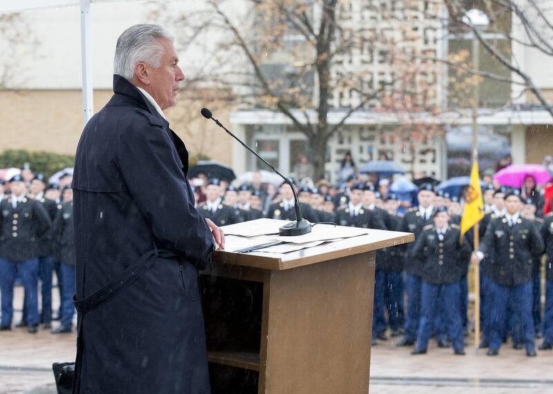 PROVO — Amid the rain and cooler temperatures, patriotic anthems welcomed students and community members to campus as cadets from the school's ROTC assembled Friday morning for the annual BYU ROTC Presidential Review and Veterans Day commemoration.