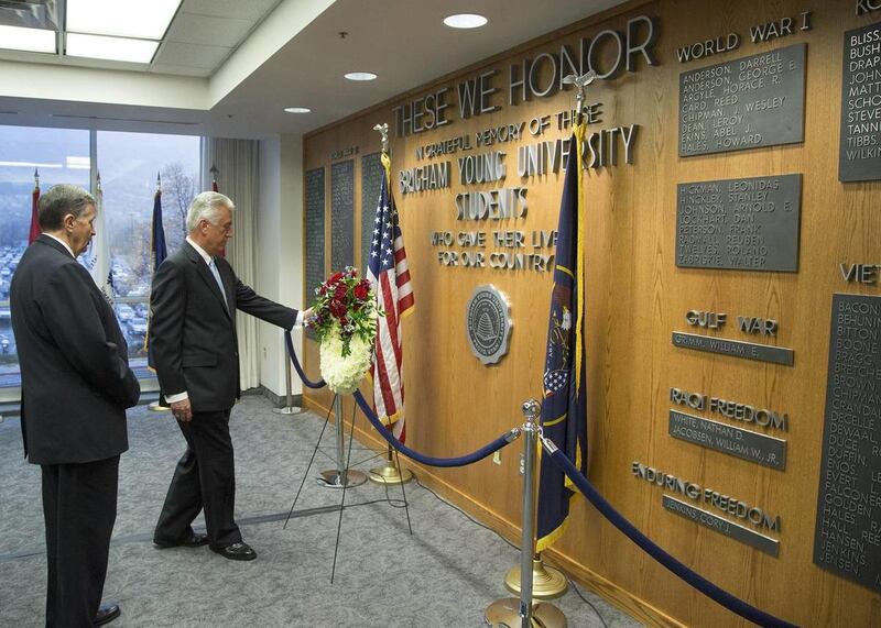 Prior to the formation on the campus for the Presidential Review, BYU President Cecil O. Samuelson joined President Uchtdorf and leaders from the BYU Army and Air Force ROTC programs to conduct a private wreath-laying ceremony in honor of the BYU students who have given their lives in defense of their country. After, cadets lined up for a flag ceremony where "Taps" was played before they marched to Brigham Square at the center of campus for the Presidential Review.