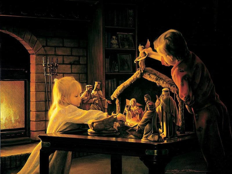 In 1993, Greg Olsen painted the Nativity in a different perspective by using children setting up a Nativity scene in their home. He used oil paint on canvas to create his artwork.