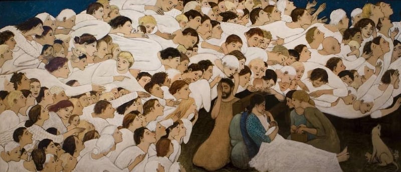 A concourse of angels attend the newborn baby Jesus in this unique piece by contemporary figurative artist Brian Kershisnik. It was completed in 2006 with the use of oil paints and stamps cut out of different patterns on canvas.