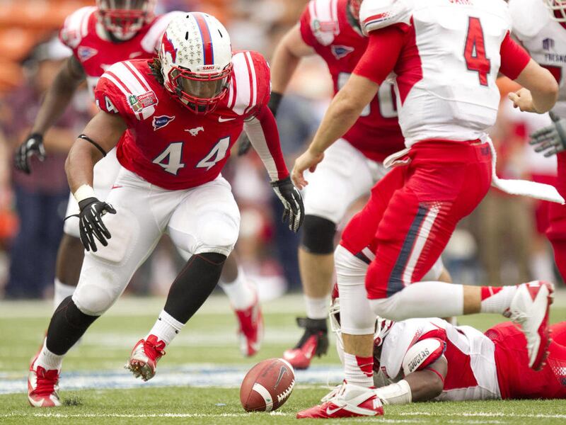 Hunt blew past right tackle Alex Fifita and blindsided Carr, dropping him flat as the ball came loose and was scooped up by Aaron Davis, who returned it 23 yards to the Fresno State 16 until he fumbled it out of bounds. SMU had to settle for a field goal. On the next series, Carr scrambled backward and couldn't escape an 18-yard sack to the 6, and then Hunt sacked him in the end zone for a safety.