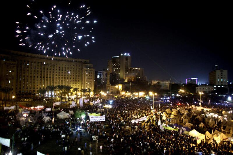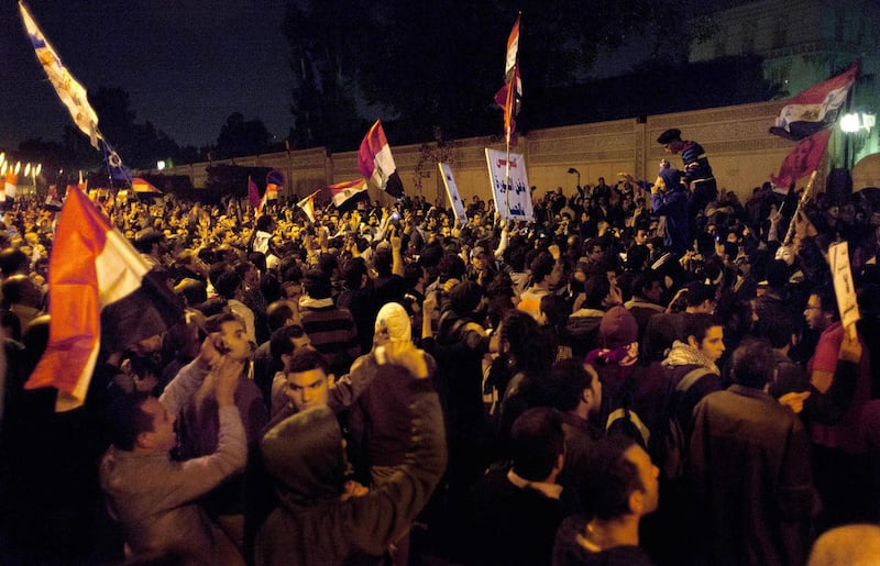 Tens of thousands also gathered in Cairo's downtown Tahrir Square, miles away from the palace, to join several hundred who have been camping out there for nearly two weeks. There were other large protests around the city separate from the one outside the palace.