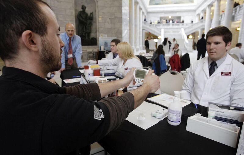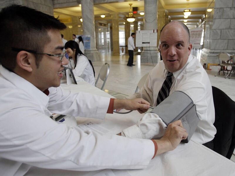 Roseman University students did health checks at the Utah state Capitol rotunda in Salt Lake City, Tuesday, Jan. 31, 2012.