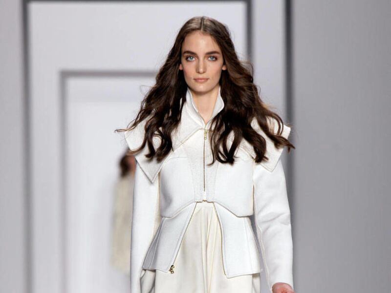 Mendel favored a light, feminine touch that fashion insiders haven't seen all that much in the first seven days of seasonal previews for fall. There was a long, graceful shape to the white cashmere coat with a white fox collar worn with a pleated chiffon blouse and wide-leg pants, and he put a fresh spin on the leather look that's been all over, using textured alligator, often paired with fur.