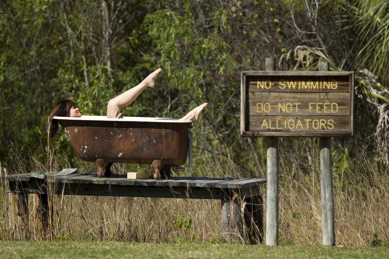Cole's property is a collection of weathered trailers with connecting decks. Statues here and there are used as props for the women to pose with: an old chicken coop, motorcycles, a tub on a platform near a sign that warns against feeding the alligators. A tree grows out of a rusted '61 Chevy, and the buildings are decorated with black and white photos of women wearing little more than cowboy hats. On a recent Sunday afternoon, two men from England stopped in, took pictures, drank a beer, then asked where they could find a gator.