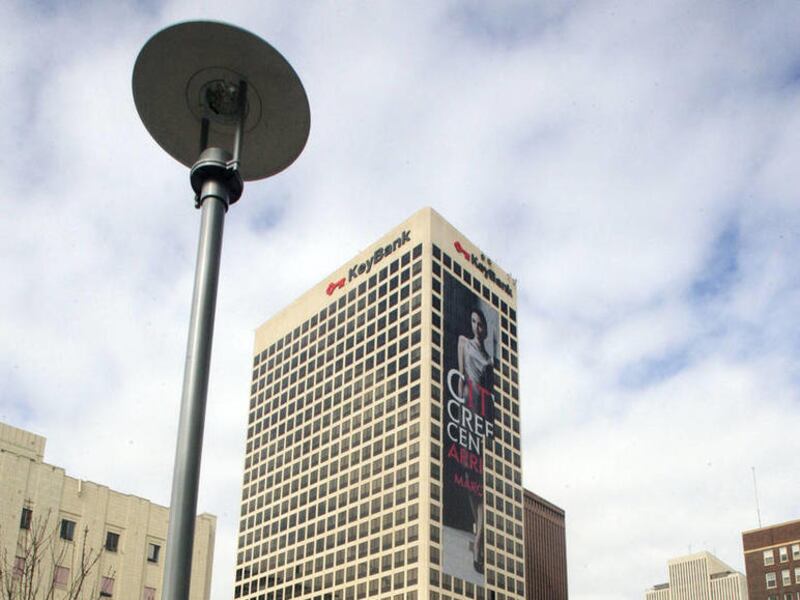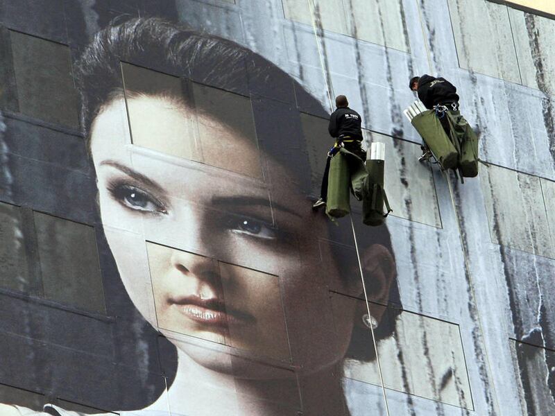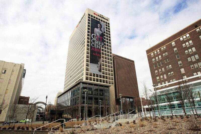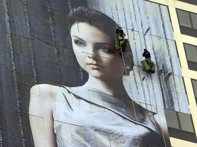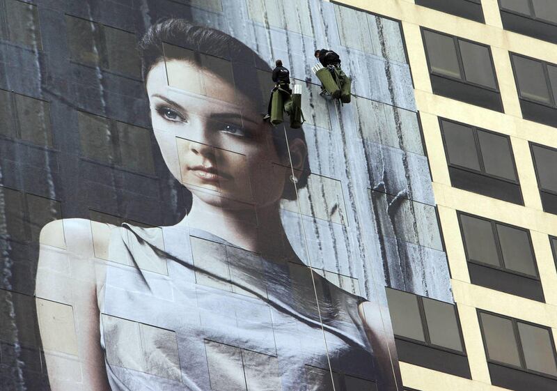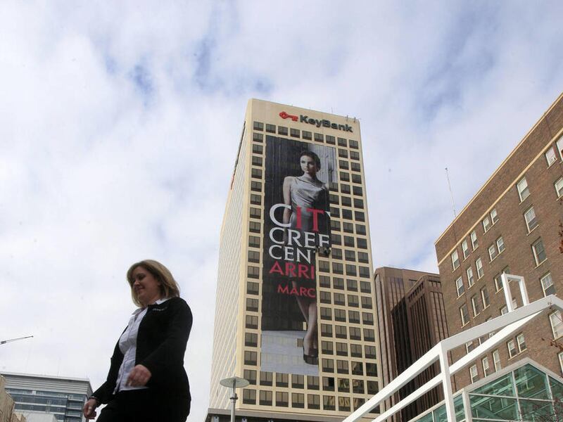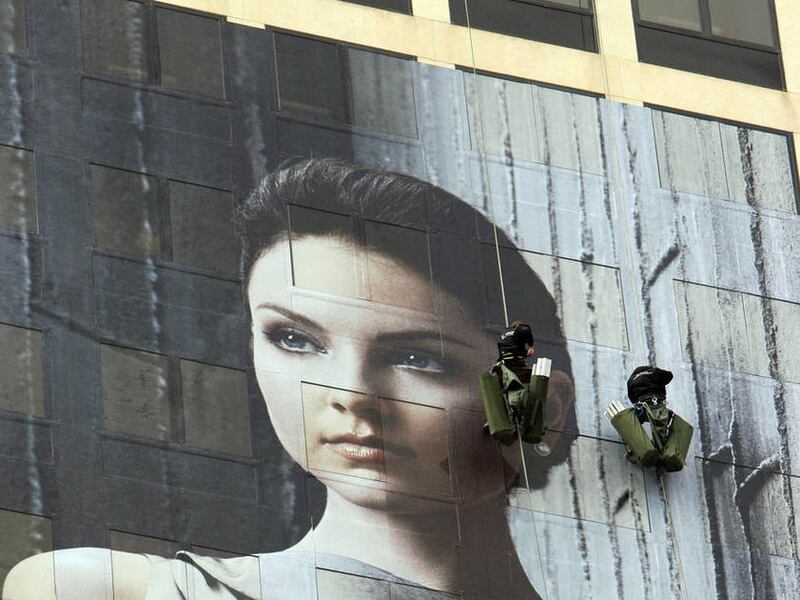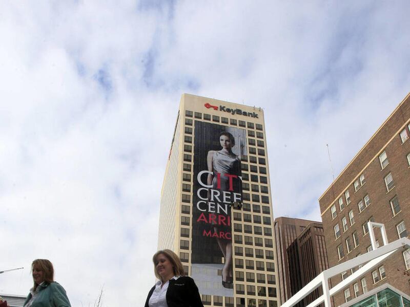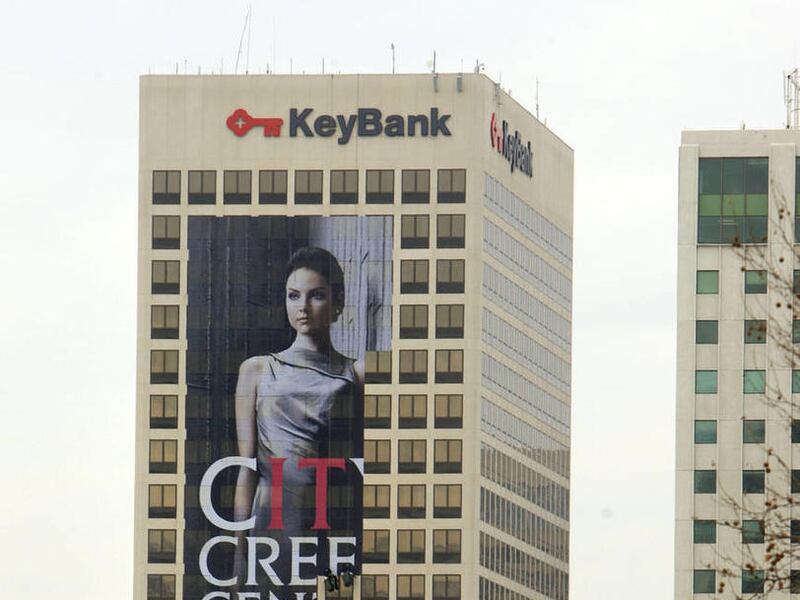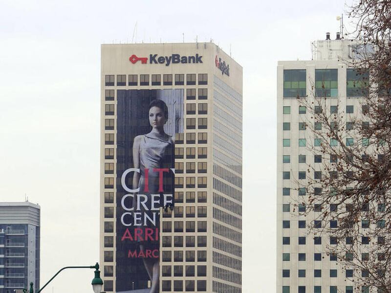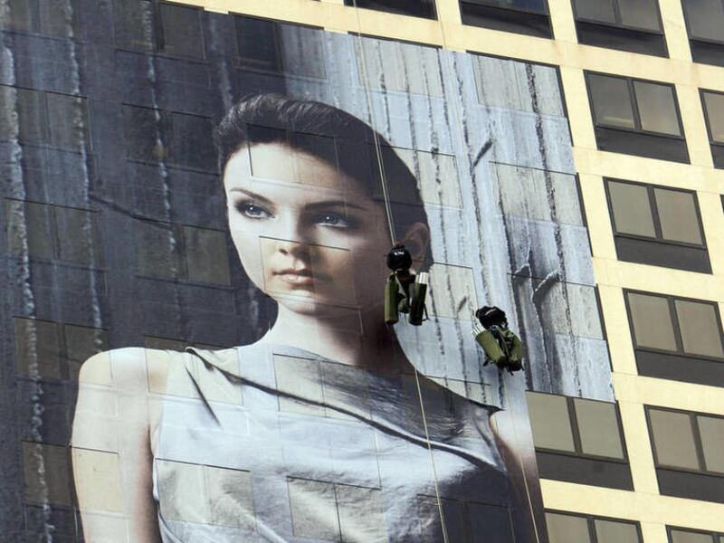 SALT LAKE CITY — Workers installed a giant City Creek mural on the Key Bank Building in Salt Lake City on Friday. The mural, announcing the arrival of the City Creek Center — a downtown retail, residential and office complex — faces State Street.