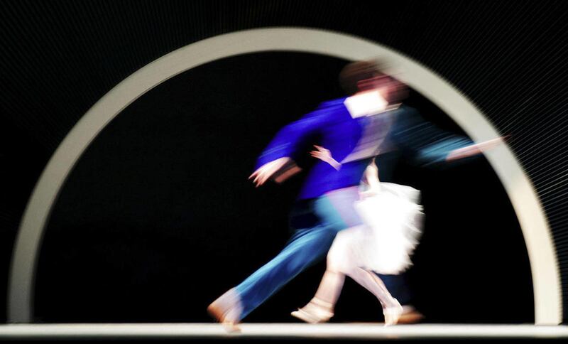 In a stage set that Baryshnikov said reminded him of a Marc Chagall painting, a dancer's elbow and leg peek through the doorway of a red house, a spot of stillness flanked by whirls of red and blue costumes.
