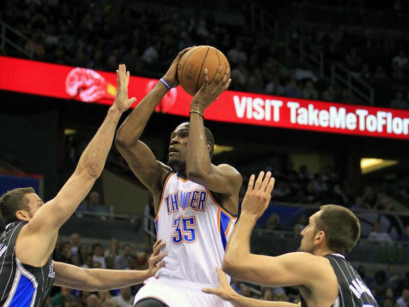 ORLANDO, Fla. — Kevin Durant scored 38 points, including 18 in the fourth quarter, and Russell Westbrook added 29 points and 10 rebounds as the Oklahoma City Thunder erased a 14-point deficit to hold on to beat the Orlando Magic 105-102 on Thursday night.