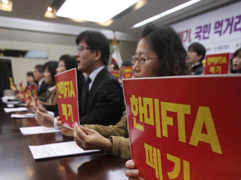 In November, South Korea's ruling party allied with conservative, pro-U.S. President Lee Myung-bak railroaded the trade deal through parliament, touching off scuffles with liberal opposition members. One enraged opposition lawmaker doused ruling party lawmakers with tear gas.