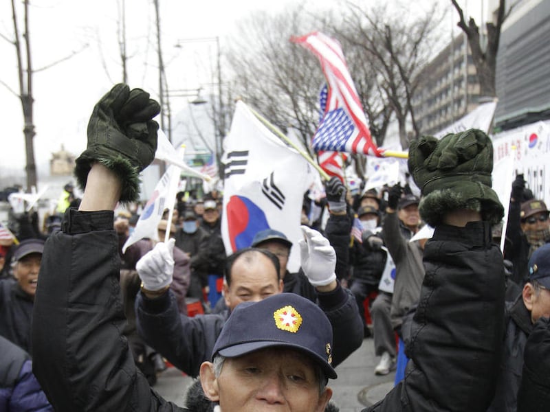 Earlier Wednesday, about 200 pro-U.S. activists supporting the deal rallied near the U.S. Embassy in Seoul, waving South Korean and U.S. national flags.