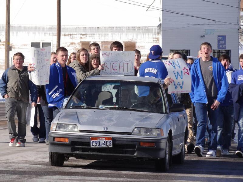 Tuesday, the halls at Tintic High School were quiet and empty. But outside the school and down Eureka’s Main Street more than half of the 109 students enrolled at the school walked out in support of Principal Jaren Wadsworth, whose contract was not renewed.