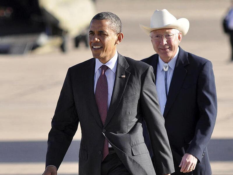 Republican Gov. Susana Martinez and Roswell Mayor Del Jurney greeted the president when Air Force One landed in Roswell about 5:20 p.m. He then boarded Marine One and headed toward the oil fields outside the town of Maljamar, population 38.